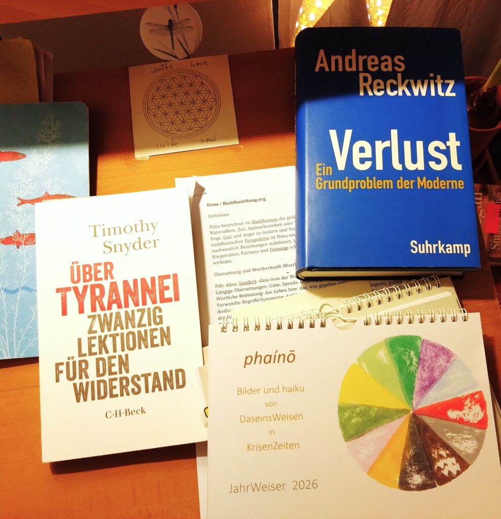Nun die Vorfreude auf mehr Weiträumigkeit 2026; eben habe ich eine ganze Reihe von Begegnungsmöglichkeiten eingetragen – vom 3-Grundsätze-TagesWorkshop und BesinnungsZeit über Frauen– und Ecosattva-Council bis zum Ökosattva-Retreat Pfingsten und einem möglichen nächsten AlltagsKoans-Zyklus. Und sicher kommt noch mehr dazu – die Welt braucht meine Meinung zwar vielleicht nicht, aber diese Zeit braucht ziemlich sicher unsere Talente…